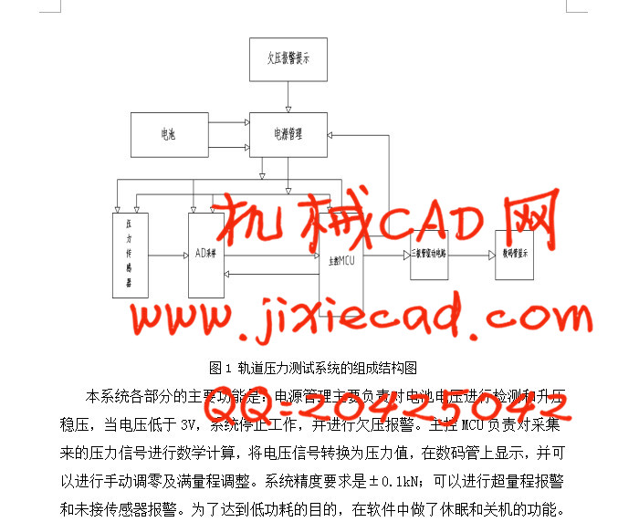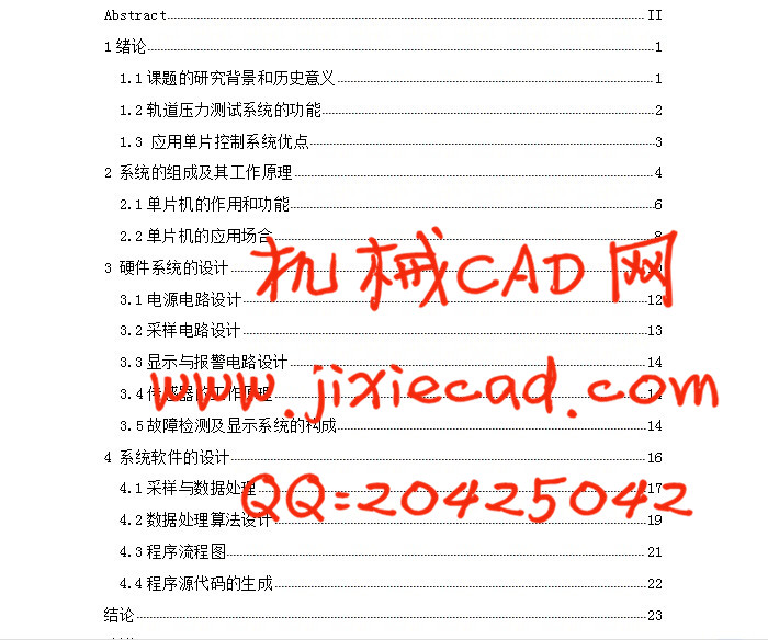轨道电路是信号联锁的室外重要设备,起着保证行车和调车作业安全的作用。它能监督检车某一固定区段内的线路是否有列车运行、调车作业或车辆占用的情况,并能显示该区段内的钢轨是否完整。它是以钢轨为导线,轨缝简用接续线连续起来,一端接电源,另一端连接受电器,通过轨道电流来工作。本文将以单片机为核心设计了轨道压力测试系统的结构图、程序指令、流程图等等,在保留了原始轨道压力测试系统的基本功能的同时又增加了一系列的实用功能并简化其电路结构,其将以控制方便,灵活,只要改变输入单片机的控制程序,便可以控制轨道压力测试系统,方便,简洁。
