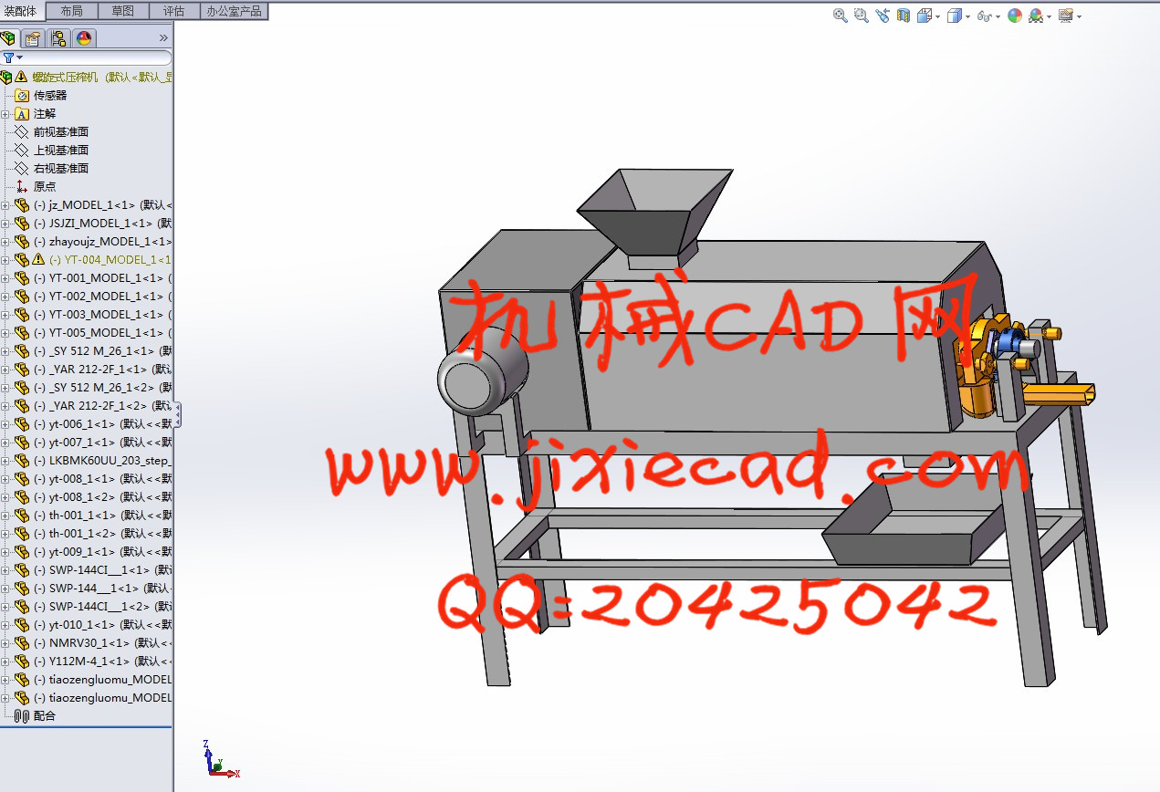 本设计是针对螺旋式压榨机的设计,主要概述了螺旋压榨机的主体构造,对螺旋式压榨机的上料、排渣、传动等机构进行了较为详细的设计。整个设计过程中从电机选择到传动机构标准件选择都经过详细计算设计,通过计算较为准确的对电机进行确定选型,对结构尺寸进行了更为细致的验证。并且通过研究对市场原有的螺旋压榨机进行了简单的改进使得设备更加适于人们的使用,更加简单方便。本设计包括对产品零部件材料的选择,对标准件可靠性的选择,以及设备使用寿命的计算和对设备维护保养的时间计算,并简单的制作了操作手册。