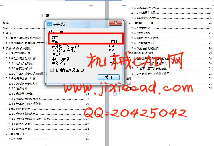 这篇毕业设计的论文主要阐述的是一套建筑卷扬机传动部分的设计方法,主要包括蜗轮蜗杆减速装置、直齿圆柱齿轮传动、轴承和传动件的润滑系统,还包括制动装置的选用、一部分常见故障的分析以及日常的使用与维护等。