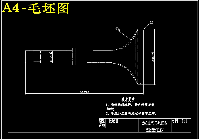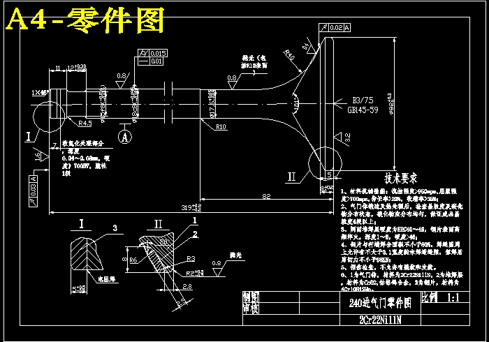 设计的零件是16V240柴油机的进气门,气阀的作用是专门负责向柴油机内输入燃料并排出废气。气阀主要分为三个部分材料组成,气门体采用的材料是耐热钢,主要是要保证其耐高温性能,还要采用固溶时效热处理,碳化物分布均匀,保证成品晶粒度4级以上。阀面堆焊一层钴铬钨合金,在高温下具有很强的耐磨,耐腐蚀,耐冲击 及高的蠕变强度,对气门寿命至关重要,堆焊层硬度为HRC40~49。小头杆端焊钢片,钢片表面高频淬火,有效提高小头端的耐冲击点蚀性能。