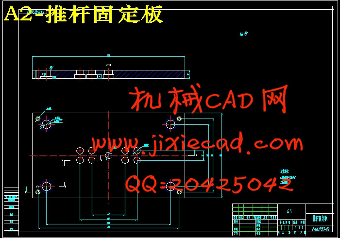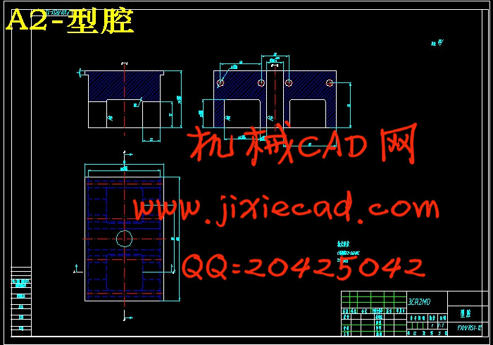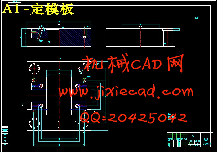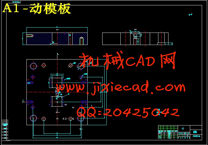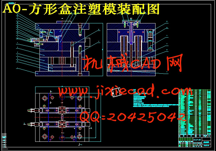 本课题是方形盒的注射模设计,要求是大批量生产。通过对塑件的结构和工艺性进行缜密的分析之后,发现塑件成型面积小且型腔较浅,所以采用了侧浇口的注射模具和直流式冷却系统。在模具的设计过程中,一些重要的尺寸(如模板厚度,顶杆直径,流道尺寸等)都经过了理论计算或取一个合理的经验数值。最后,我们根据UG生成的一整副模架来作为参考,通过进一步的计算,在CAD中绘制出装配图和成型零部件的零件图。