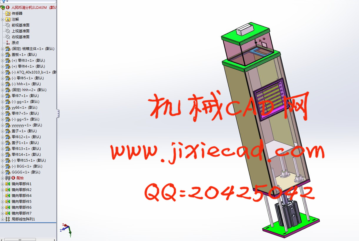 本设计主要针对目前城市公交公司、商贸和银行关于钱币的分类、清点、整理需求而设计。目前以上场合的钱币分类主要依赖于人工,人力成本高且效率低下。本机械设备的主要功能是对混杂在一起的各种纸币和硬币进行分类、清点、整理。本设计准确、实用。可部分或者全部替代人工,减少人力成本。