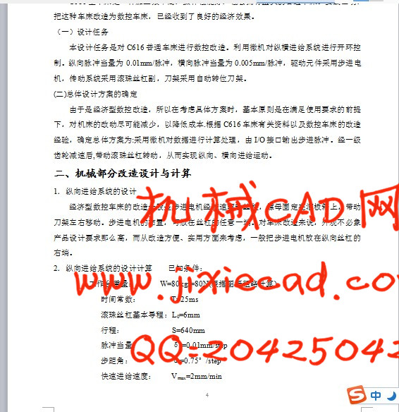 本设计任务是对C616普通车床进行数控改造。利用微机对纵横进给系统进行开环控制。纵向脉冲当量为0.01mm/脉冲,横向脉冲当量为0.005mm/脉冲,驱动元件采用步进电机,传动系统采用滚珠丝杠副,刀架采用自动转位刀架。