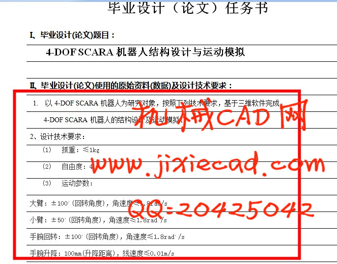 This paper designs an industrial SCARA robot. SCARA robot (full name Selectively Compliance Articulated Robot Arm) is very similar to human arm movement, which includes the shoulder elbow and wrist joints to achieve horizontal and vertical movement. It is an industrial robot has four degrees of freedom. Among them, the three rotational degrees of freedom, the other is the DOF. It can achieve planar motion, with the flexibility, the whole arm in the vertical stiffness, flexibility in the horizontal direction of the large, widely used in assembly operations.
