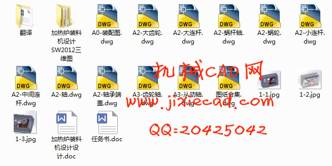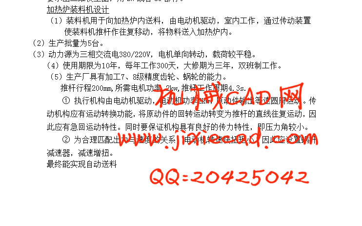 This graduation design is the design of a heating furnace charging machine. The loader is summarized; then analyzes the selection principle and the calculation method of the filling machine; then calculated based on these design criteria and selection method in accordance with the requirements of the given parameters selection and design; then check on the major components of loader selected. In the design, heating furnace charging machine manufacturing and application, at present our country compared with foreign advanced level there are still large gaps, China in the design and manufacture of heating furnace charging machine process there are many shortcomings.The structure is mainly produced by the motor power will need to transfer the power to the gear, and then transferred to the gear through the gear, the gear and the transition to another set of gear, and then through the transition to the worm gear. Design of key parts and the scheme of charging machine were introduced in detail, the main contents include system overall plan design, the choice of motor, actuator design, transmission parts of the design, the flywheel design, shaft design and checking and bearing selection, etc..