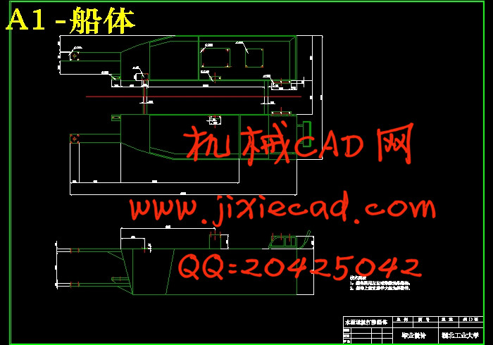 为减小船的阻力,船体采用左右双体结构,船以蓄电池供电,分别驱动直流电动机和马达,马达驱动船的前进与转向,电动机通过减速器的减速后,分别通过带传动驱动打捞传送链和过渡链轮,打捞传送链把垃圾从水面运到垃圾储存仓,如果垃圾储存仓装满了后,可以用人工将其倒入船体中,而过渡链轮通过链传动驱动锥齿轮的主动轴,动力通过锥齿轮减速器驱动收集装置。从而完成垃圾的打捞,它的主要特点是能用左右收集轮双向伸缩回转,将垃圾集中到双船体的中间,运送机构再将垃圾从水面运到双船体的垃圾储存仓,垃圾储存仓将垃圾中的水排出,减少了垃圾的体积与重量,水面垃圾清理船结构设计合理,运行机动灵活,操作简单可靠,使用范围广,制作成本低,有着良好的应用前景和推广价值。