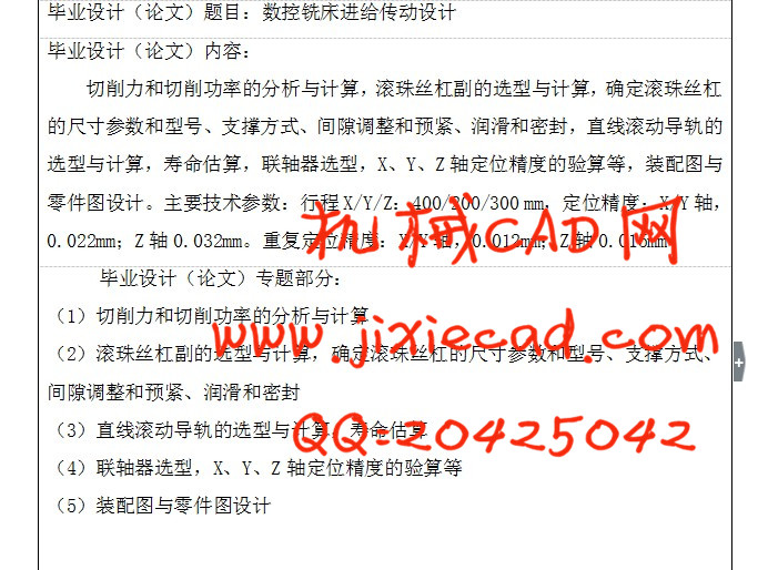 毕业设计(论文)内容: 切削力和切削功率的分析与计算,滚珠丝杠副的选型与计算,确定滚珠丝杠的尺寸参数和型号、支撑方式、间隙调整和预紧、润滑和密封,直线滚动导轨的选型与计算,寿命估算,联轴器选型,X、Y、Z轴定位精度的验算等,装配图与零件图设计。主要技术参数:行程X/Y/Z:400/200/300 mm,定位精度:X/Y轴,0.022mm;Z轴0.032mm。重复定位精度:X/Y轴,0.012mm;Z轴0.015mm |