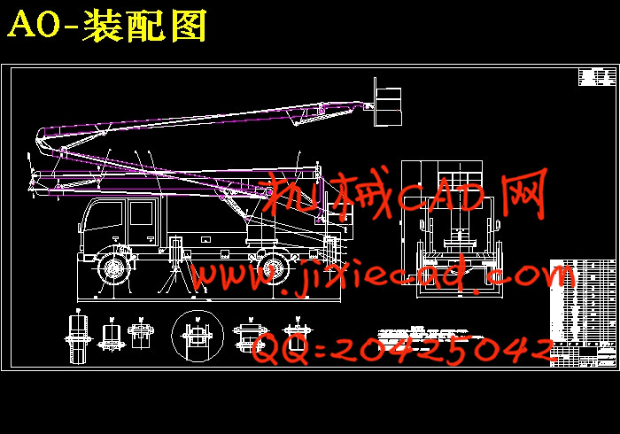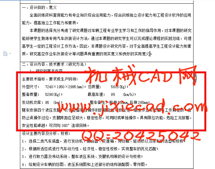 Focuses on JX1060TSG23 aerial second class chassis selection and the overall layout, power transmission equipment design analysis, work equipment design analysis and analysis, the last vehicle stability check.