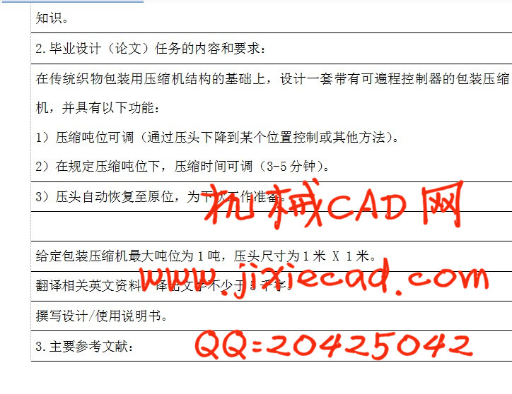 经编织物是有弹性的物品,为了生产运输方便,需要压缩包装,由于每一种产品规格及种类多样性,要求在传统织物包装用压缩机结构的基础上,设计一套带有可遍程控制器的包装压缩机,并具有以下功能: